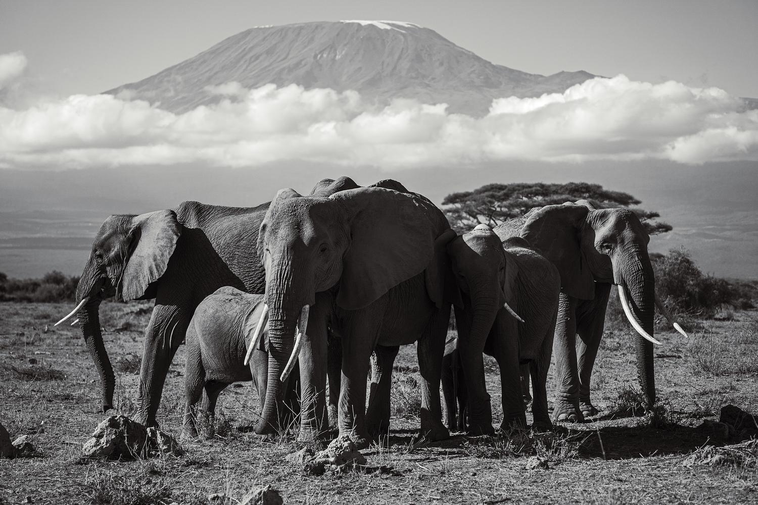 A heard of elephants stand majestically at the base of Mt. Kilimanjaro - an iconic African representation of Kenya/Tanzania
