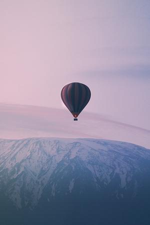 A hot air balloon safari rises high into the sky over Amboseli national park during sunrise. The snow capped peak of My. Kilimanjaro below.