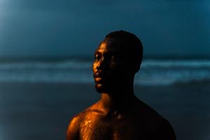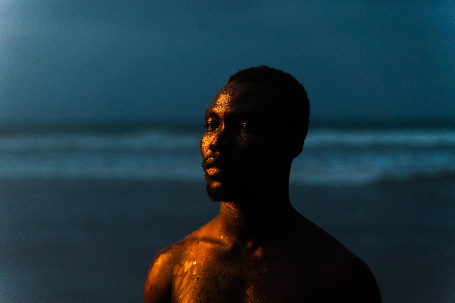 Busua, Western Ghana Teddy, Part of the Justice Brother's - poses in during blue hour. Portion of the sale is attributed to the Justice brothers surf school.